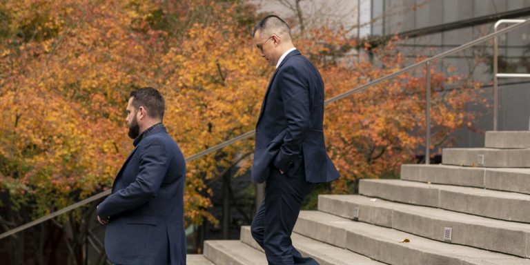 Binance CEO Changpeng Zhao, right, leaves federal court in Seattle on Tuesday.