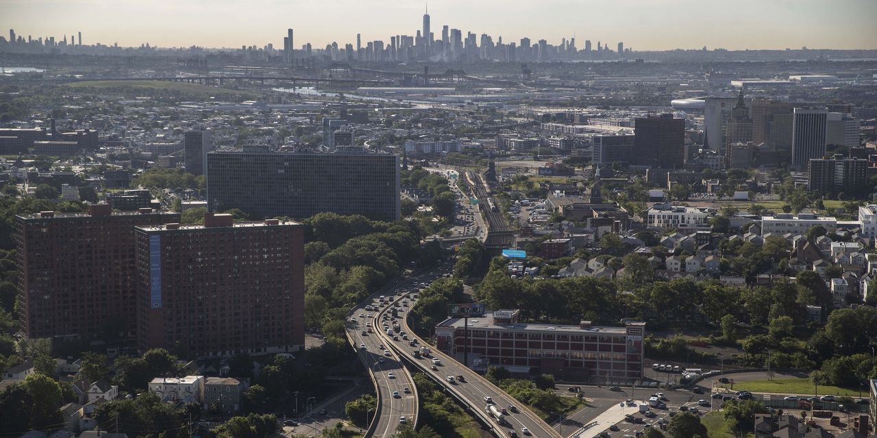 Vehicles travel along roads in Newark, N.J., in 2021. A Newark Parking Authority bond could 7.9% for investors in the highest tax bracket.