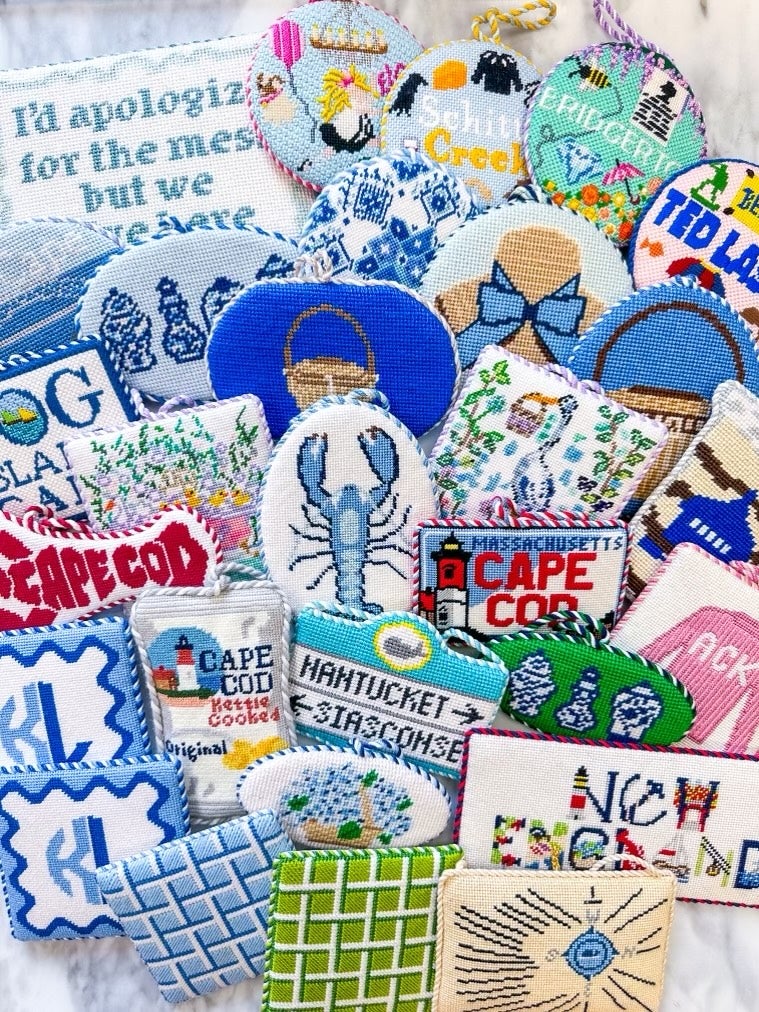 As I began searching for cuter accessories for myself, I found that many custom items had a 100-item minimum. At the time, I had a business bank account for my blog, so I used that money to order the inventory and knew that I could at least sell 90 of them to my followers who also needlepointed. After making a few canvases and seeing the demand, I realized I had enough ideas to launch a larger collection online. So I bought the smallest Shopify package, started sourcing needleminders and project bags, and recruited my friends and family to help paint canvases.
