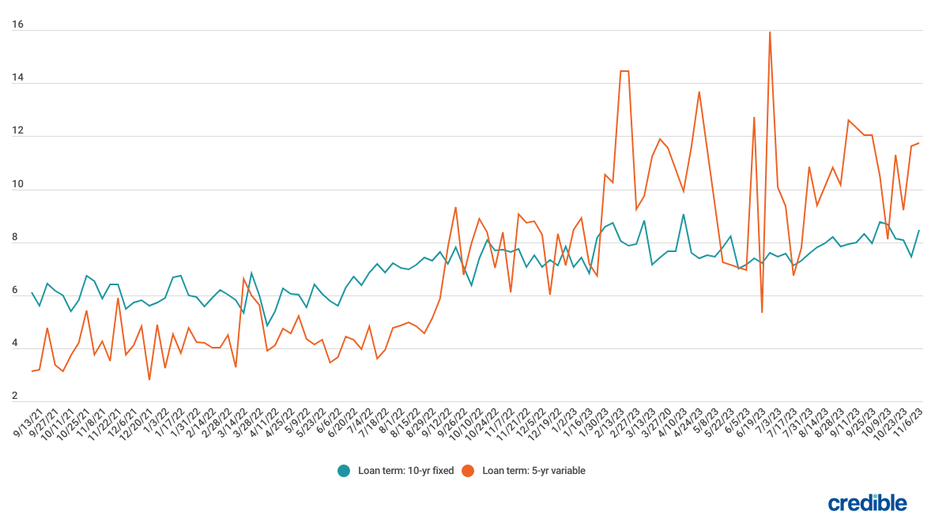During the week of Nov. 6, 2023, average private student loan rates increased for borrowers with credit scores of 720 or higher who used the Credible marketplace to take out 10-year fixed-rate loans and 5-year variable-rate loans.